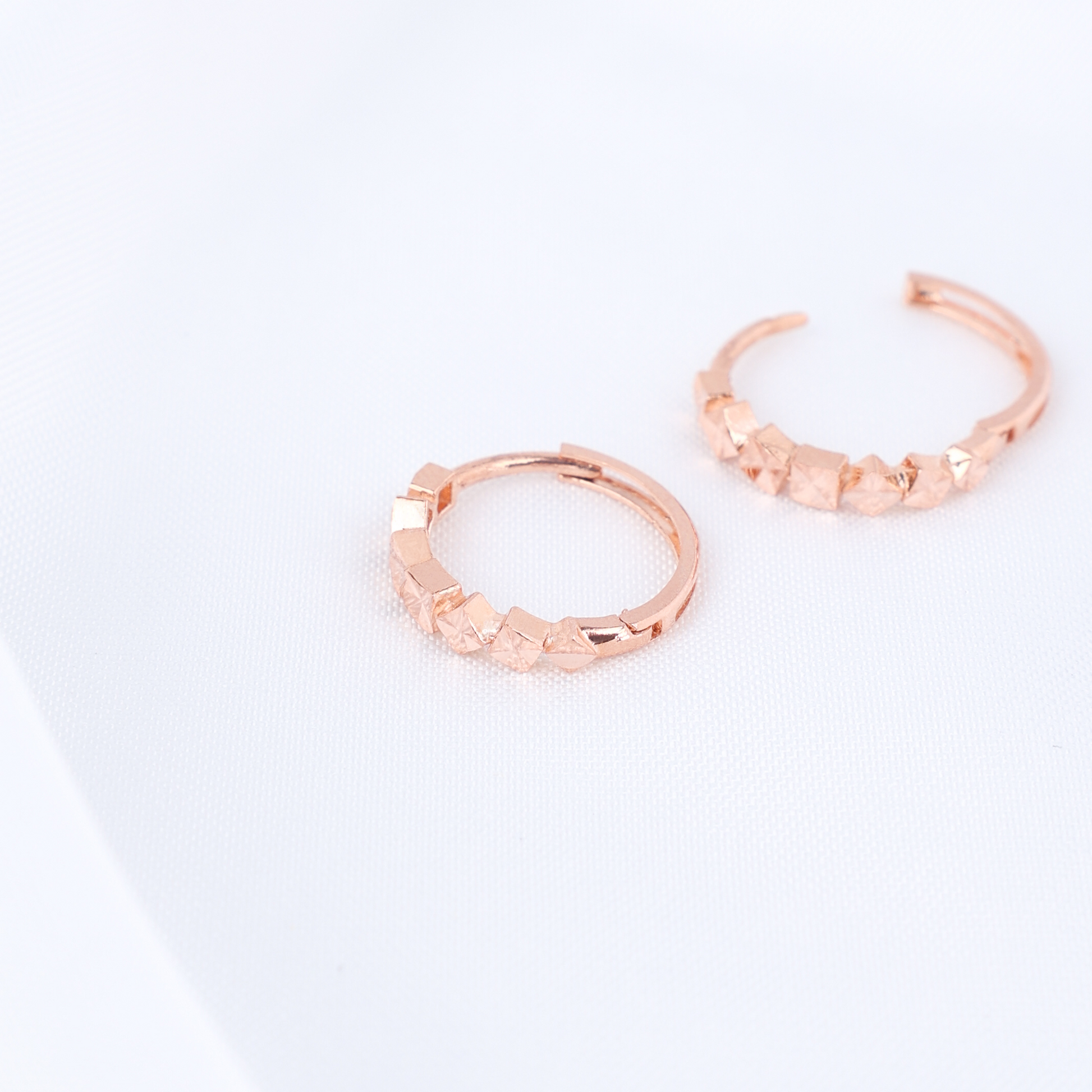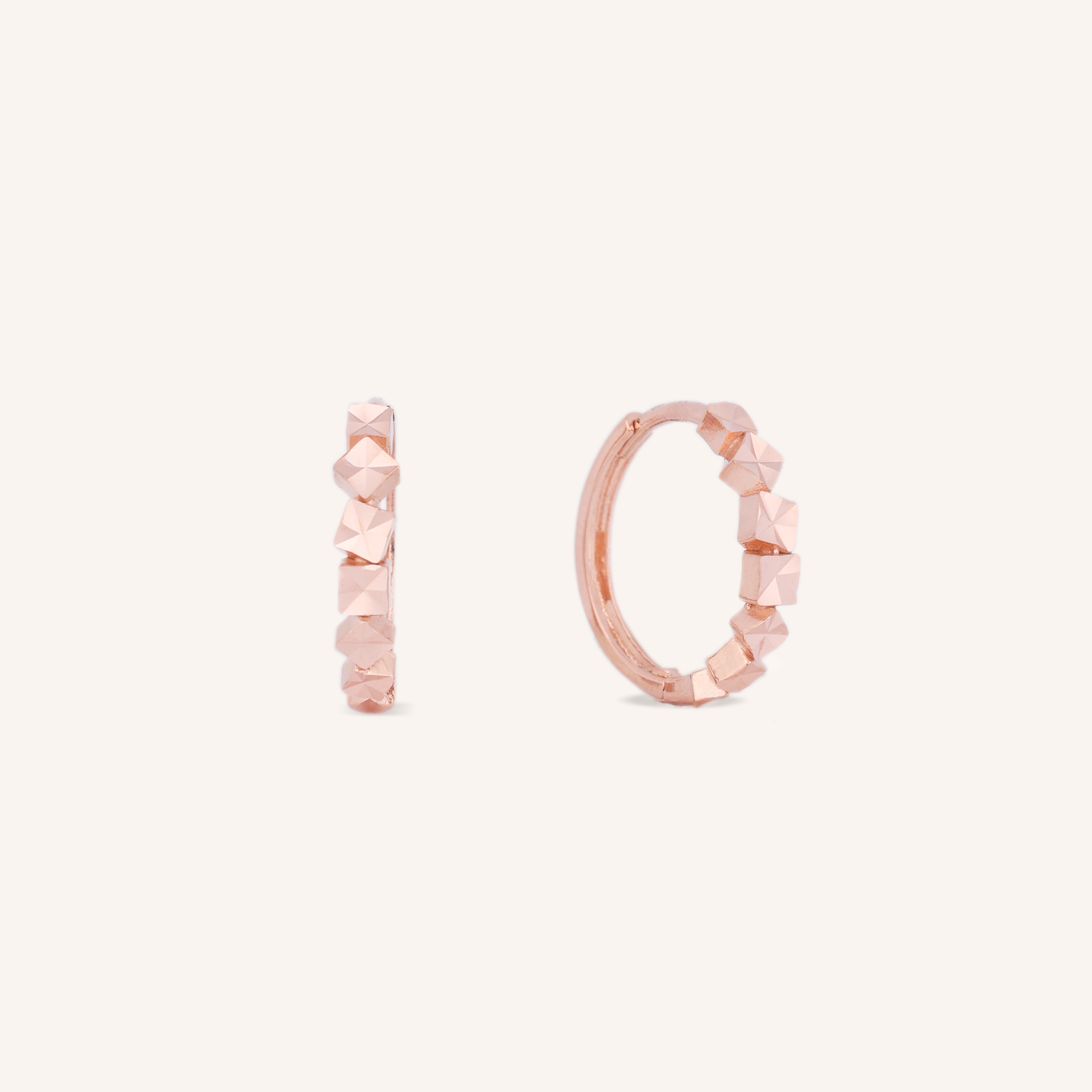 A refined pair of earrings designed with individually faceted cube shapes. Each cube is angled differently and faceted to catch and reflect light, creating a shimmer with every turn.
