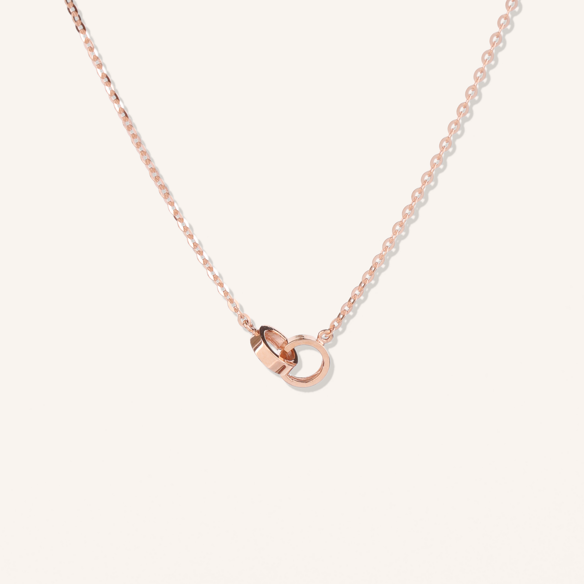 The Interlock Necklace features a minimalist pendant design with two small interlocking rings, symbolizing connection. The refined gold color and sleek polished finish make it a versatile piece that complements any outfit.