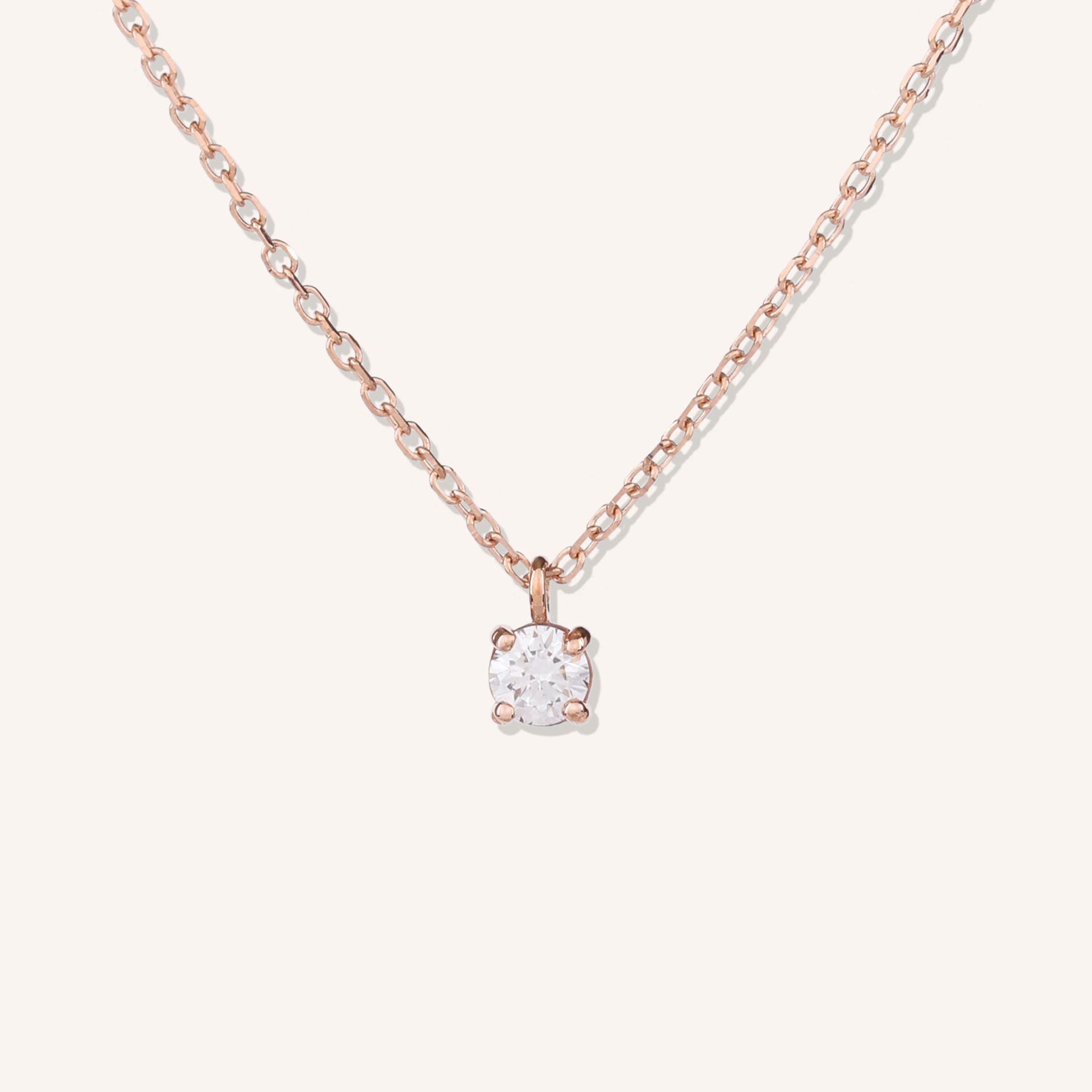 Suspended from a delicate chain, the design features a round brilliant cut lab grown diamond that reflects light beautifully from every angle. Set in a timeless four-prong setting, the stone captures the essence of understated elegance and natural brilliance.