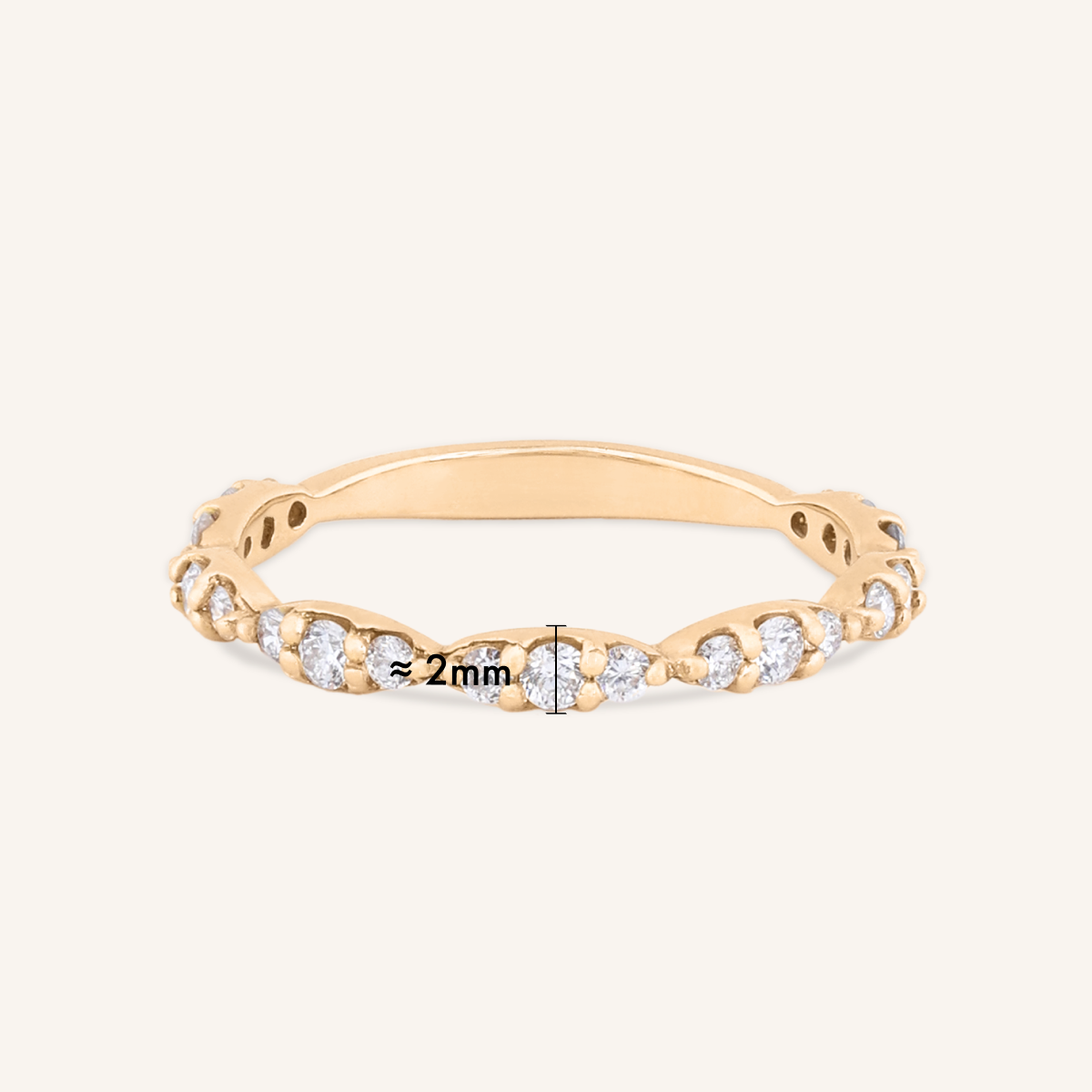This is a half eternity band, set with 21 lab-grown diamonds that wrap gracefully across the top of your finger, catching the light with every movement. The intricate setting brings out the sparkle of each stone while maintaining a refined, graceful look.