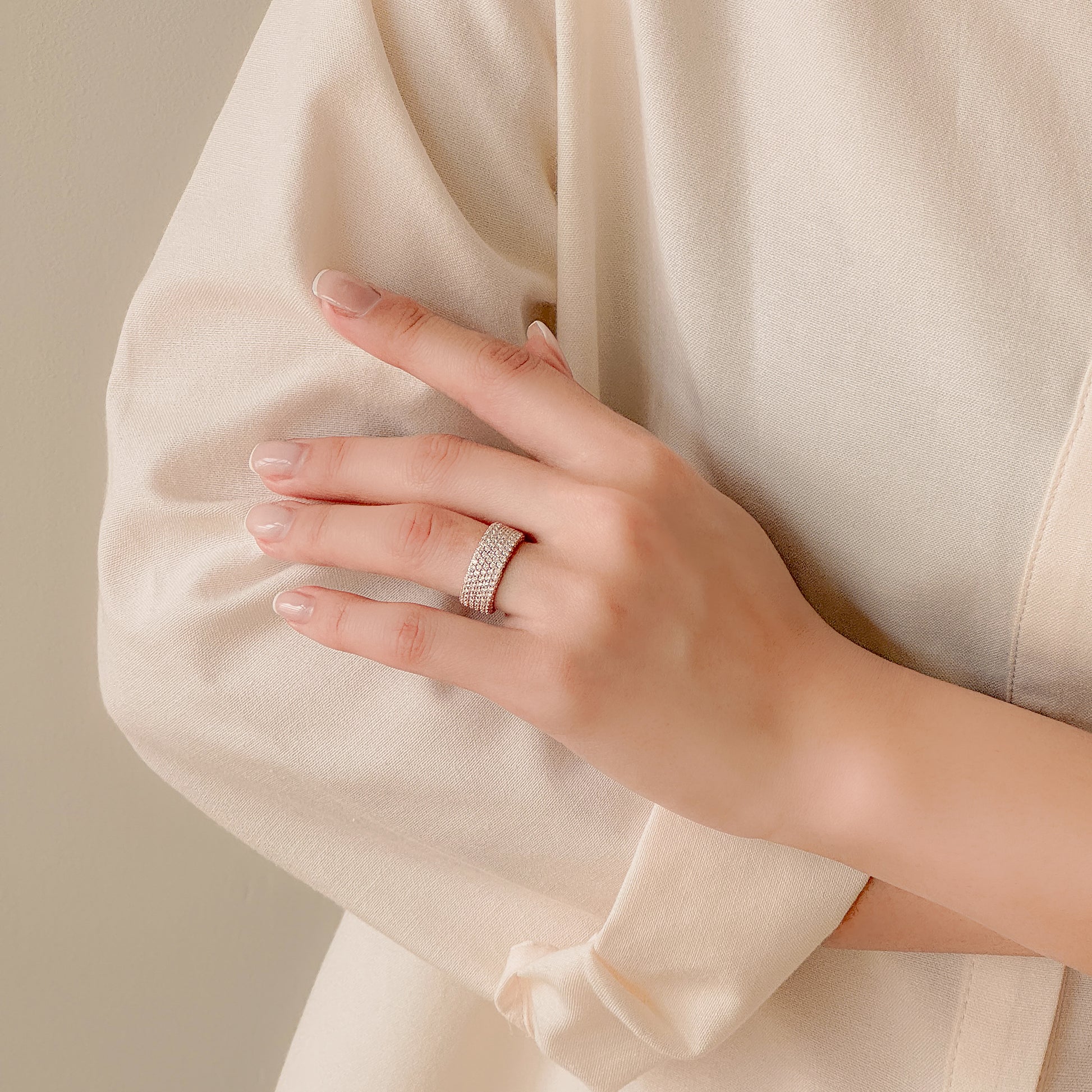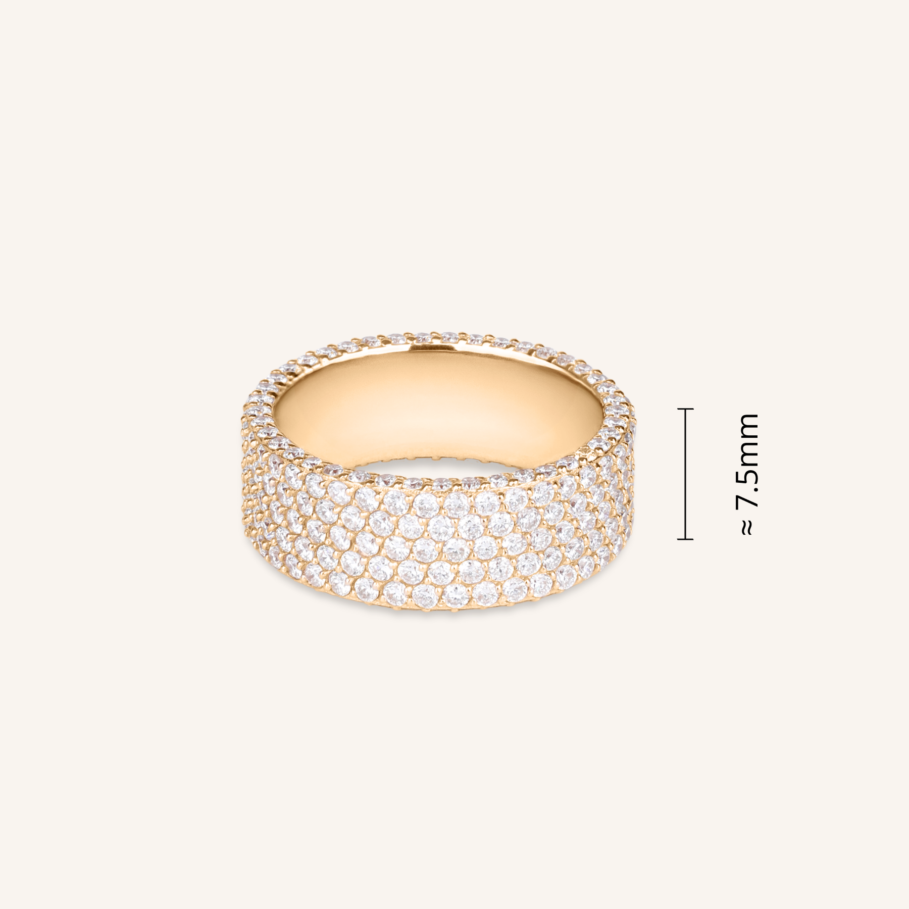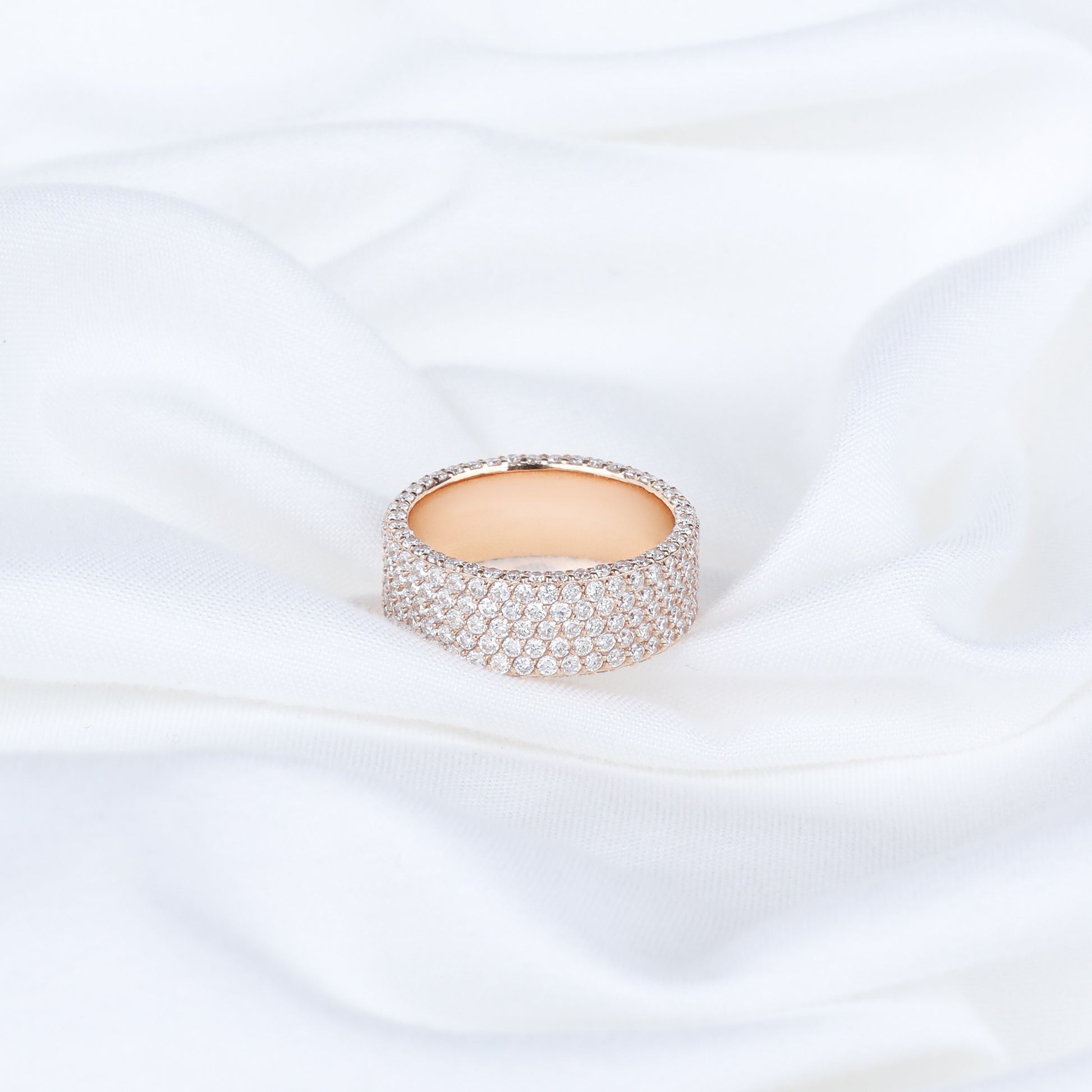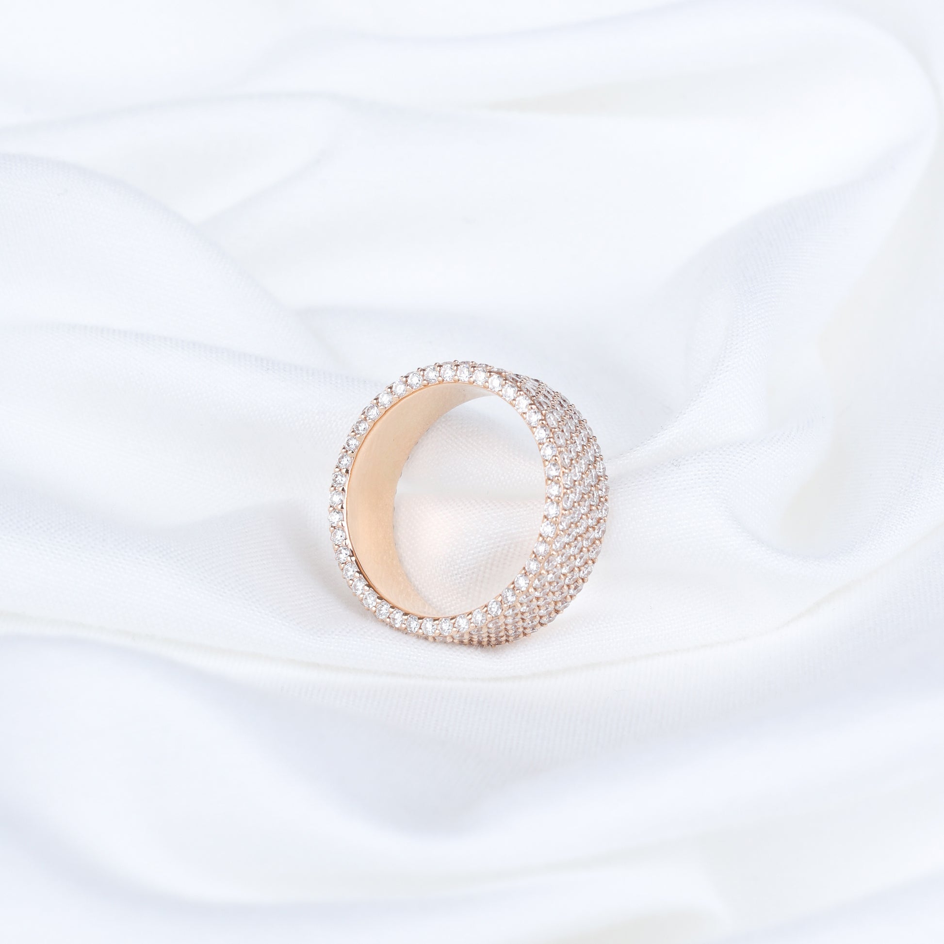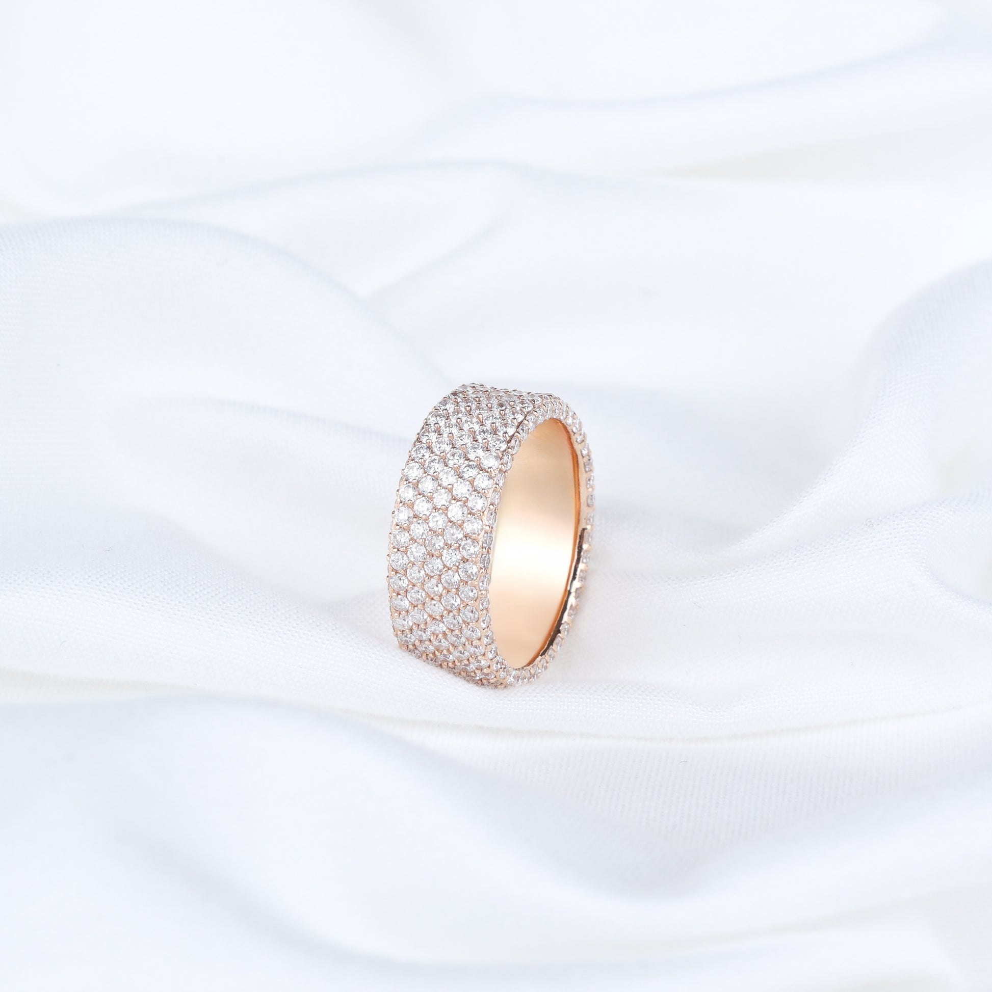 Brilliant, meticulously set diamonds flow seamlessly across the entire surface of the band, creating a design that immediately draws the eye. Diamonds are set not only along the front, but also along the sides, ensuring radiant sparkle from every angle.