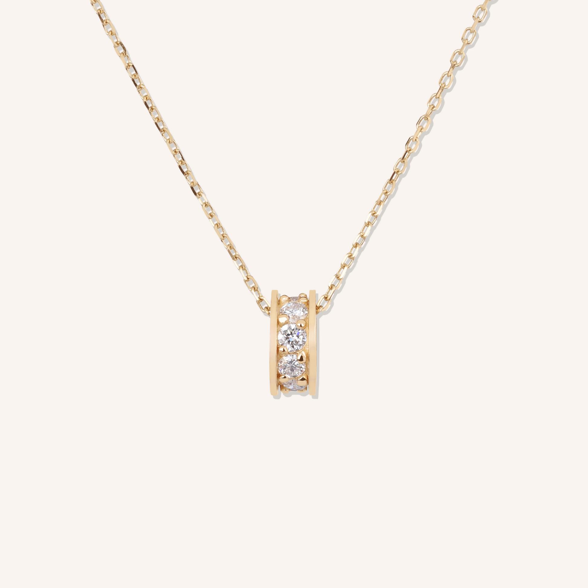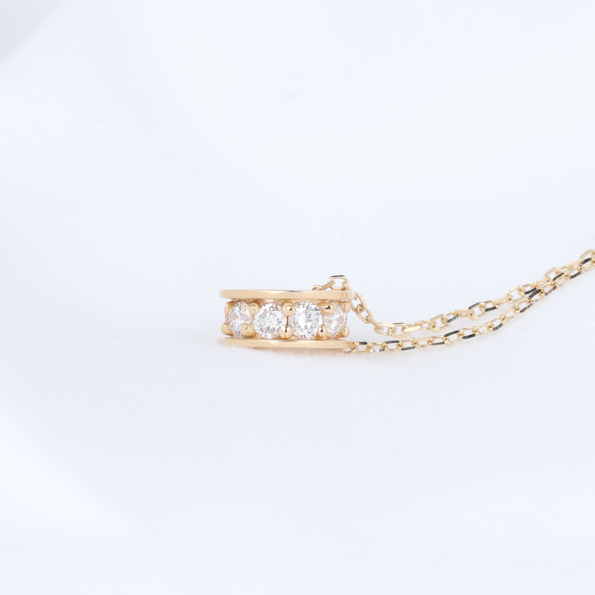 Featuring a circular ring-shaped pendant set with lab grown diamonds, the softly contoured gold form adds dimension and a subtle glow.