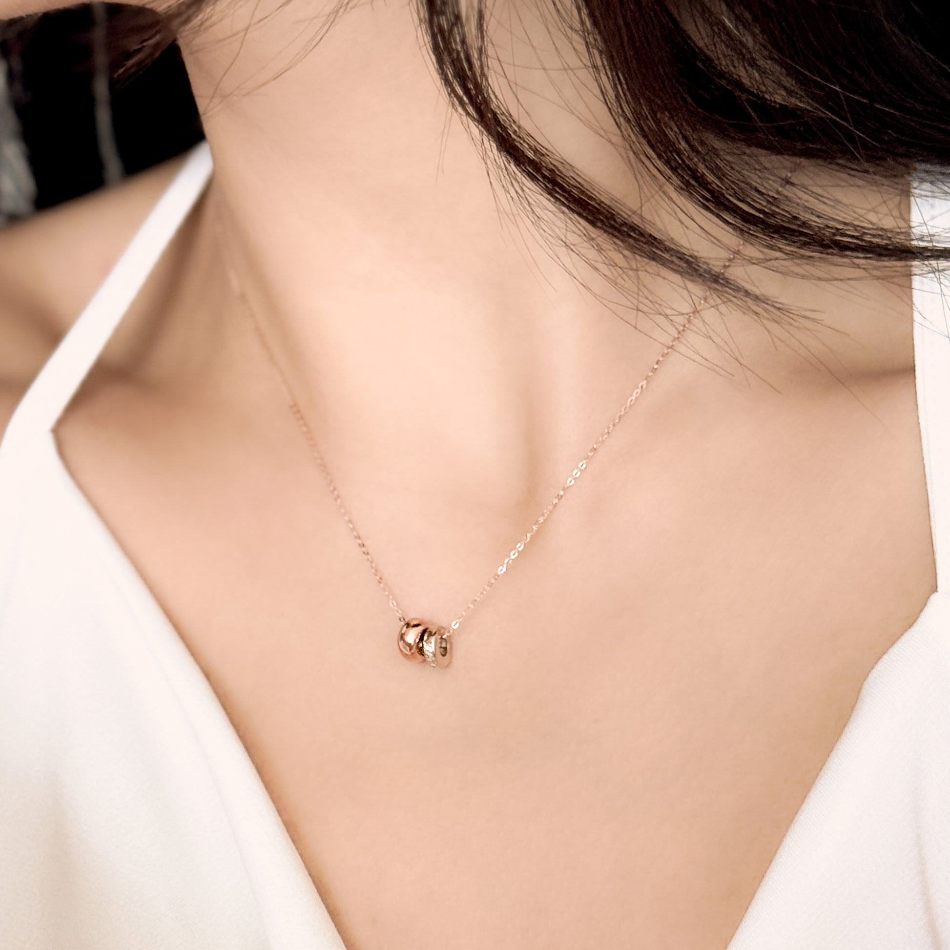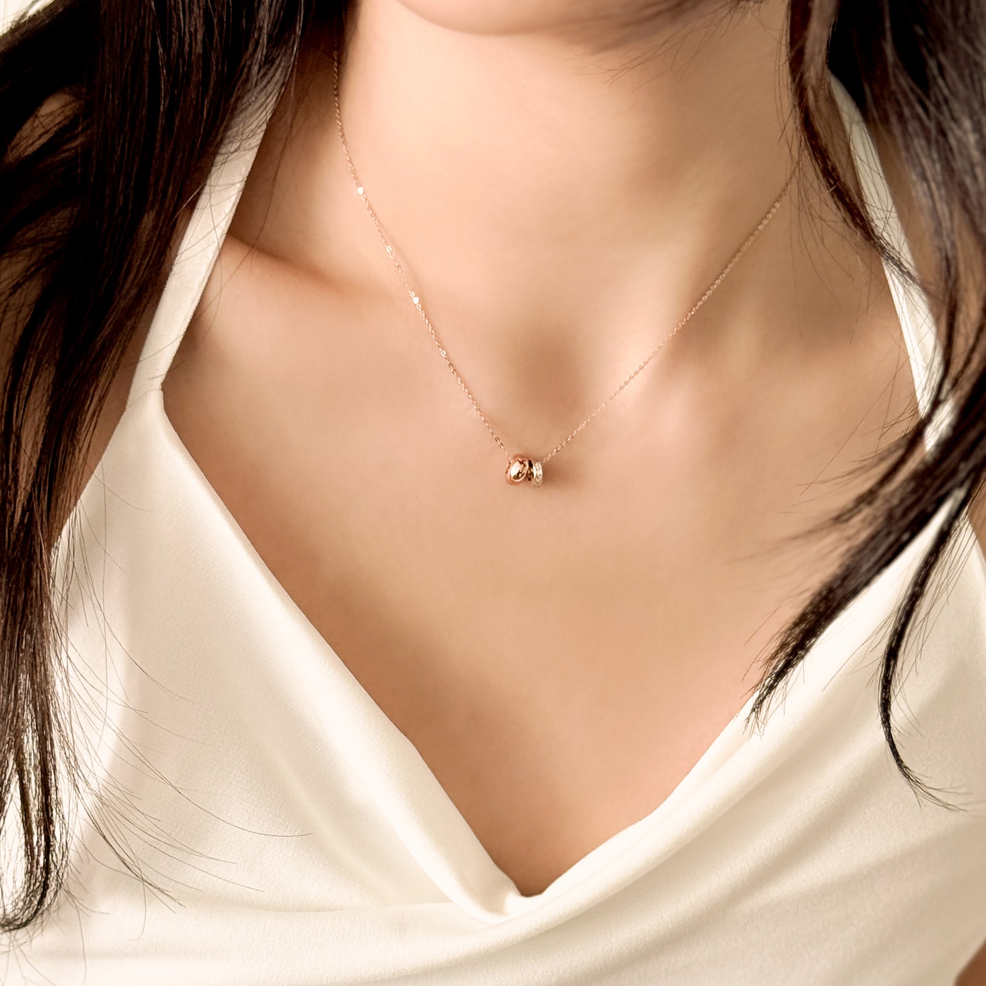 A modern necklace featuring two ring pendants that come together in perfect harmony — each with its own unique charm. One ring shines with the warm, soft glow of solid gold, while the other adds a subtle sparkle with delicately set cubic zirconia on white gold. The white gold ring is left unplated to preserve its natural beauty — a soft, warm hue that feels quietly elegant.