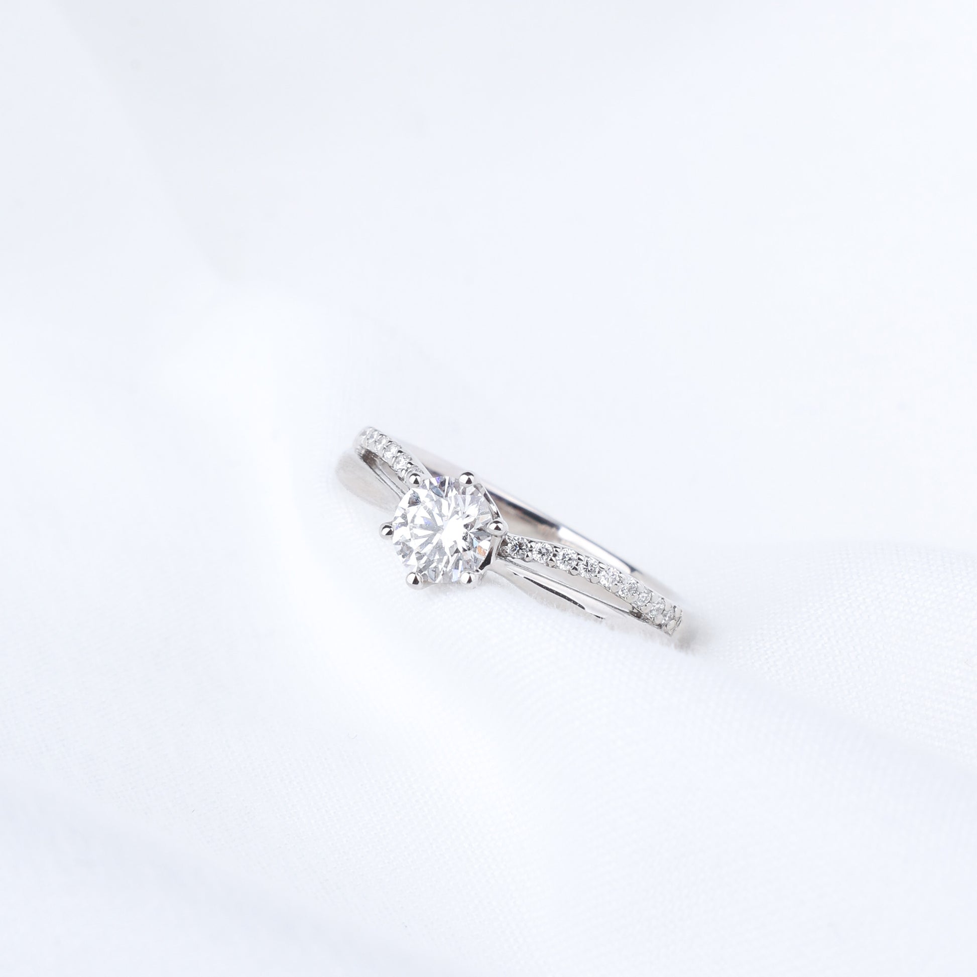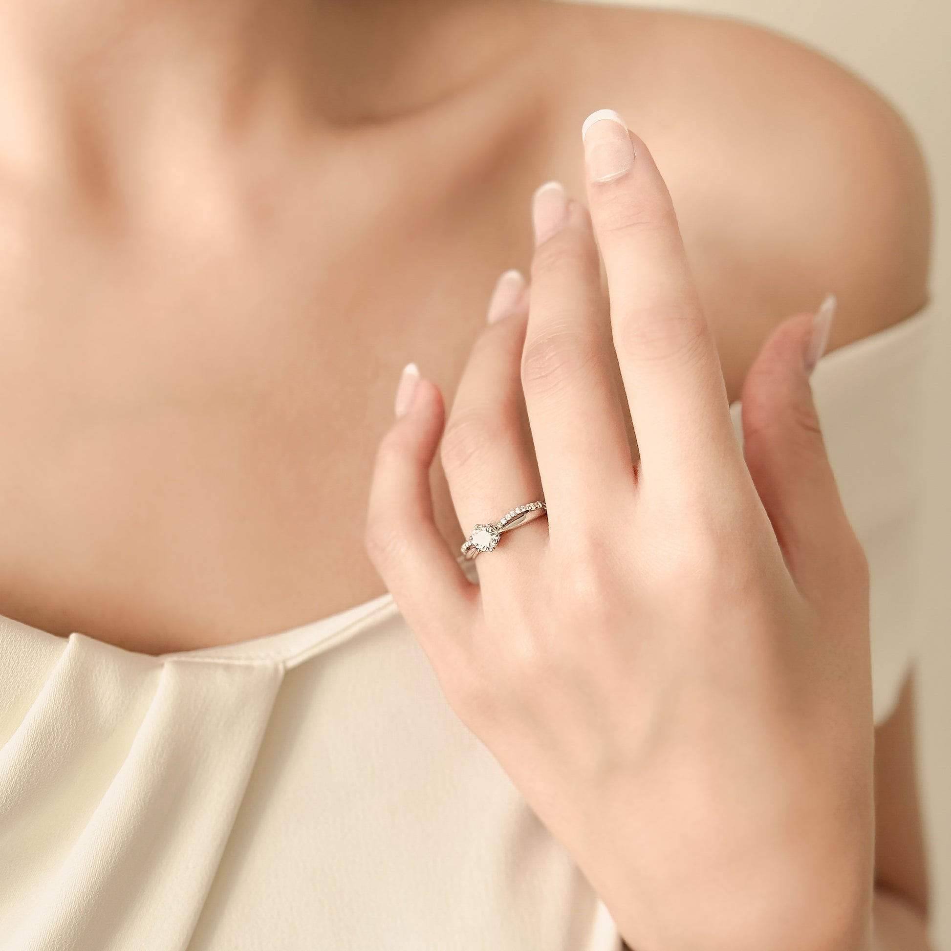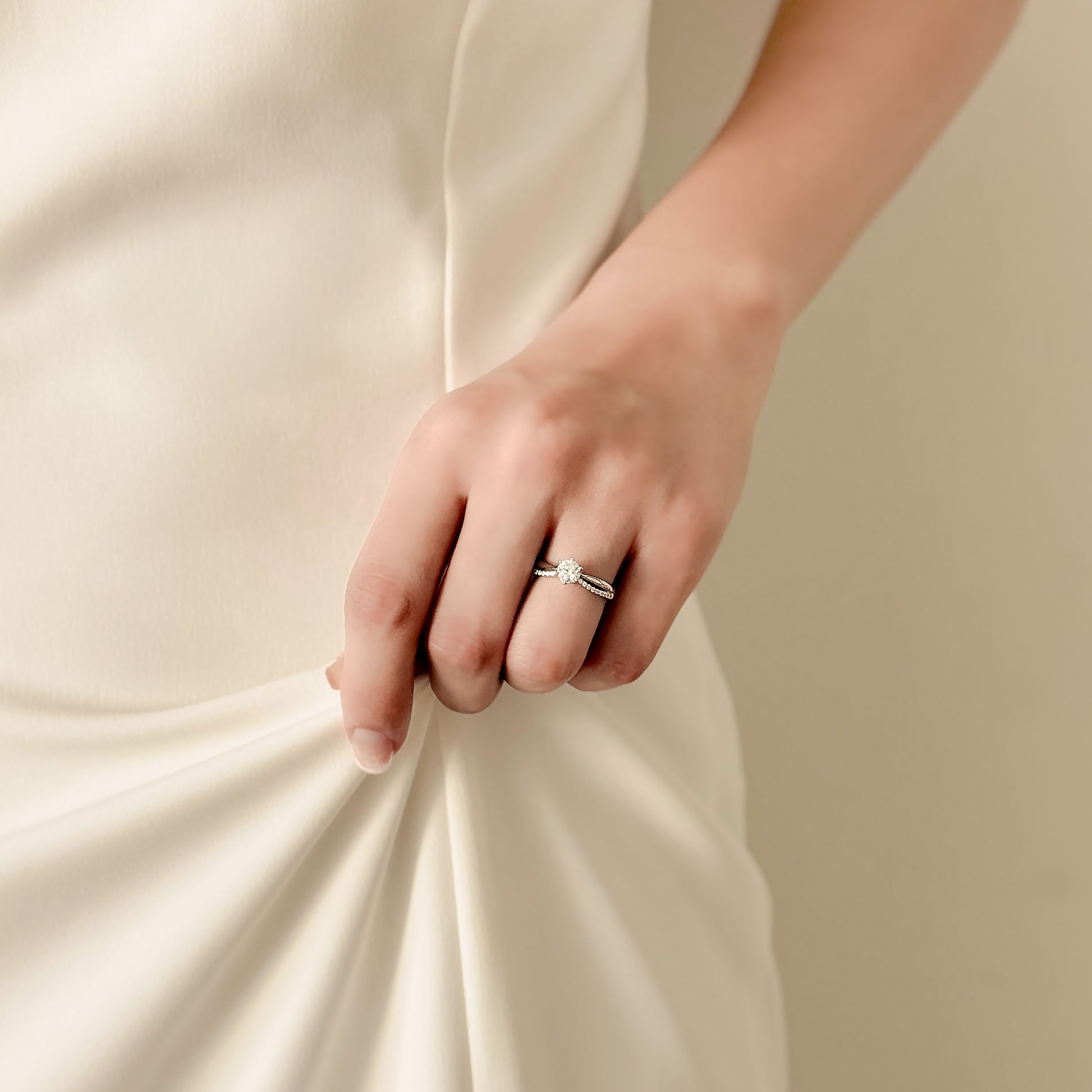 The band features a split shank structure that opens gracefully from the main stone to the midpoint, creating a naturally layered and dimensional silhouette. The row of melee diamonds along the upper band enhances the design with the visual effect of an engagement ring paired with a guard ring, offering a polished and sophisticated presence.