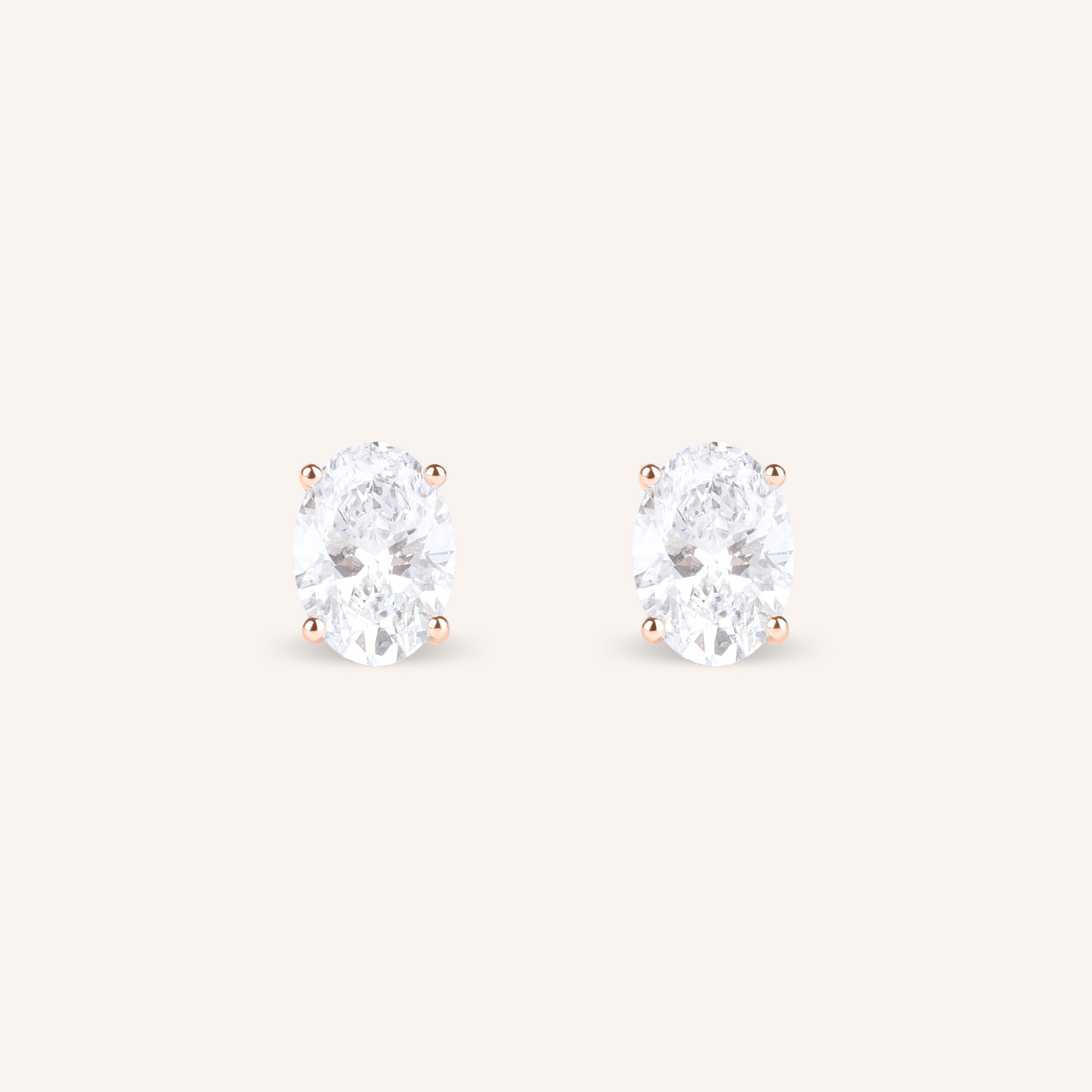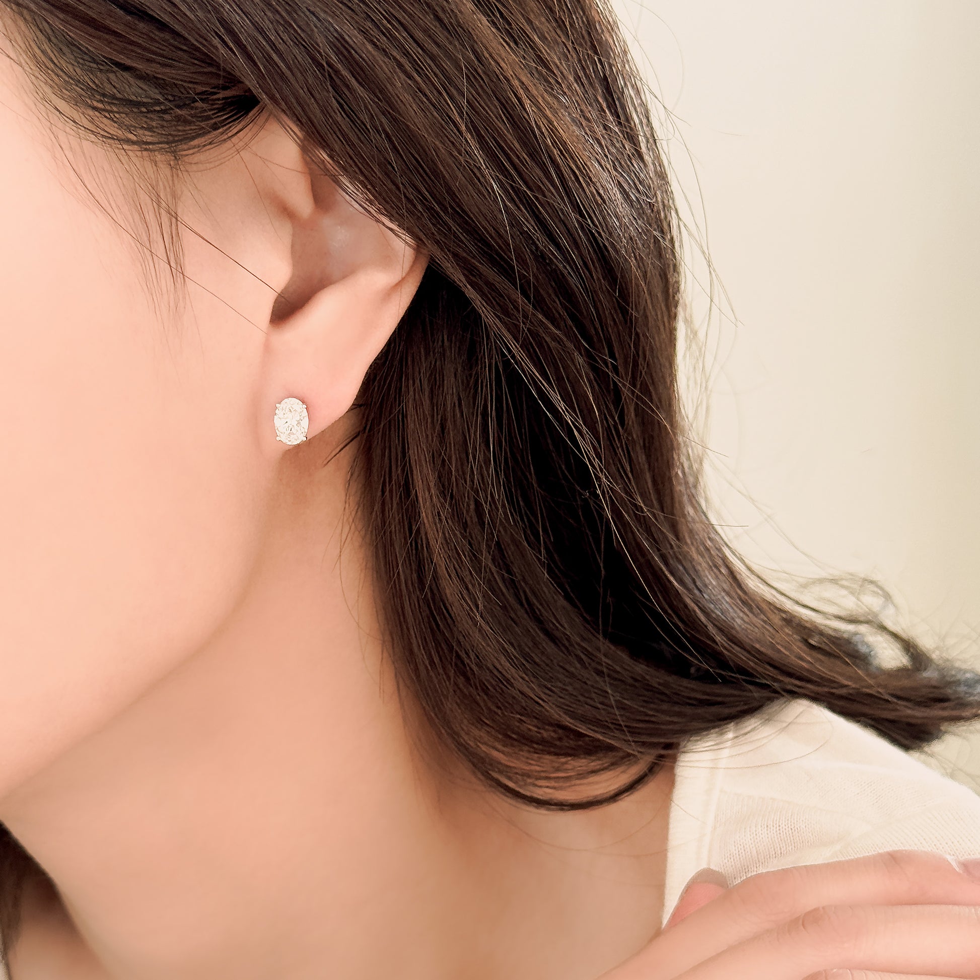 Each earring features a 1ct (2ct total) oval-cut lab-grown diamond, set in a refined four-prong basket that allows maximum light to enter from every angle. The elongated oval silhouette creates a soft yet striking presence on the ear, while the minimal open-gallery setting enhances sparkle and keeps the earrings lightweight for comfortable daily wear.