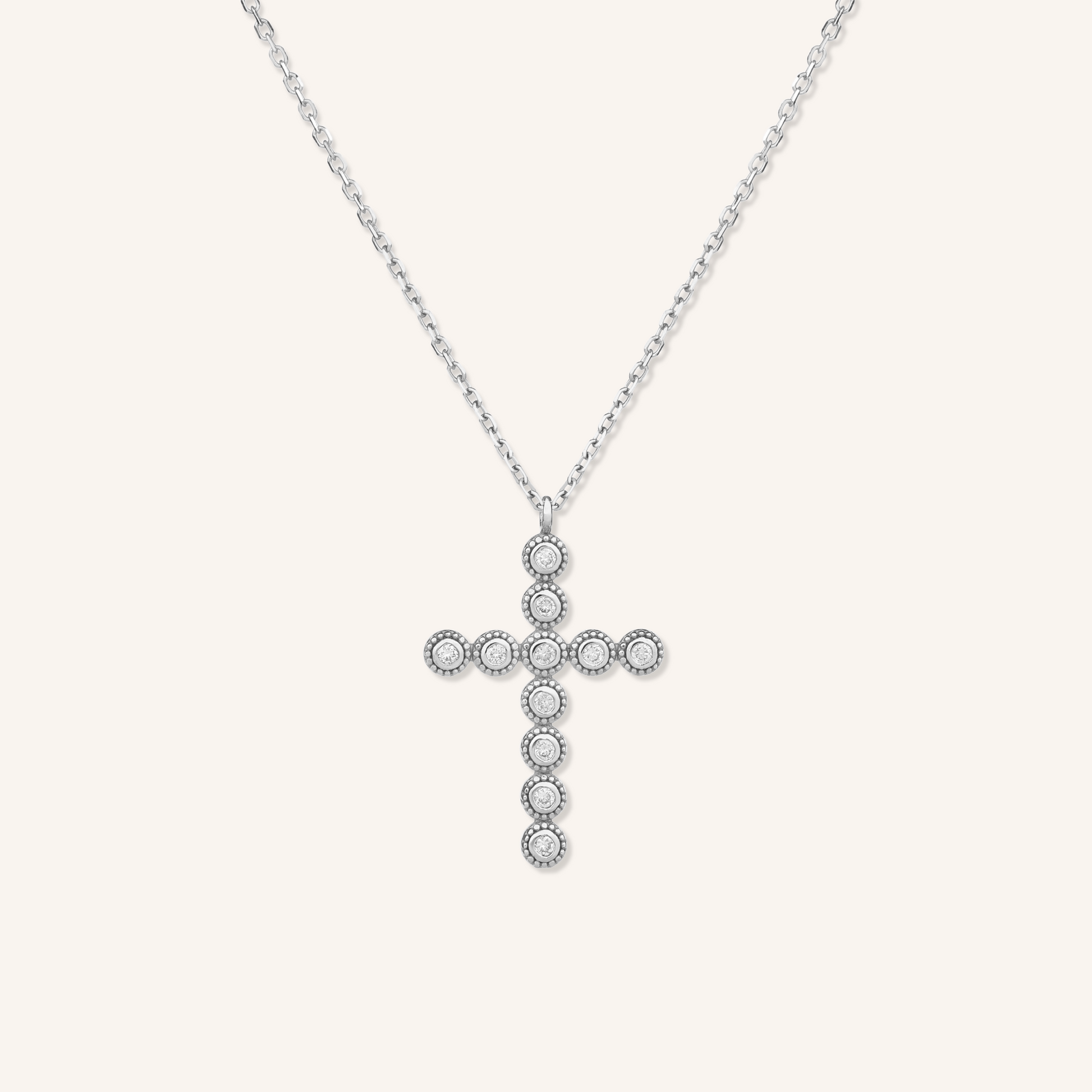 A modern reinterpretation of the classic cross silhouette, crafted from a series of bezel-set lab-grown diamonds. Each stone is individually framed in a smooth, rounded bezel, creating a soft sequence of light that forms the cross with quiet elegance.