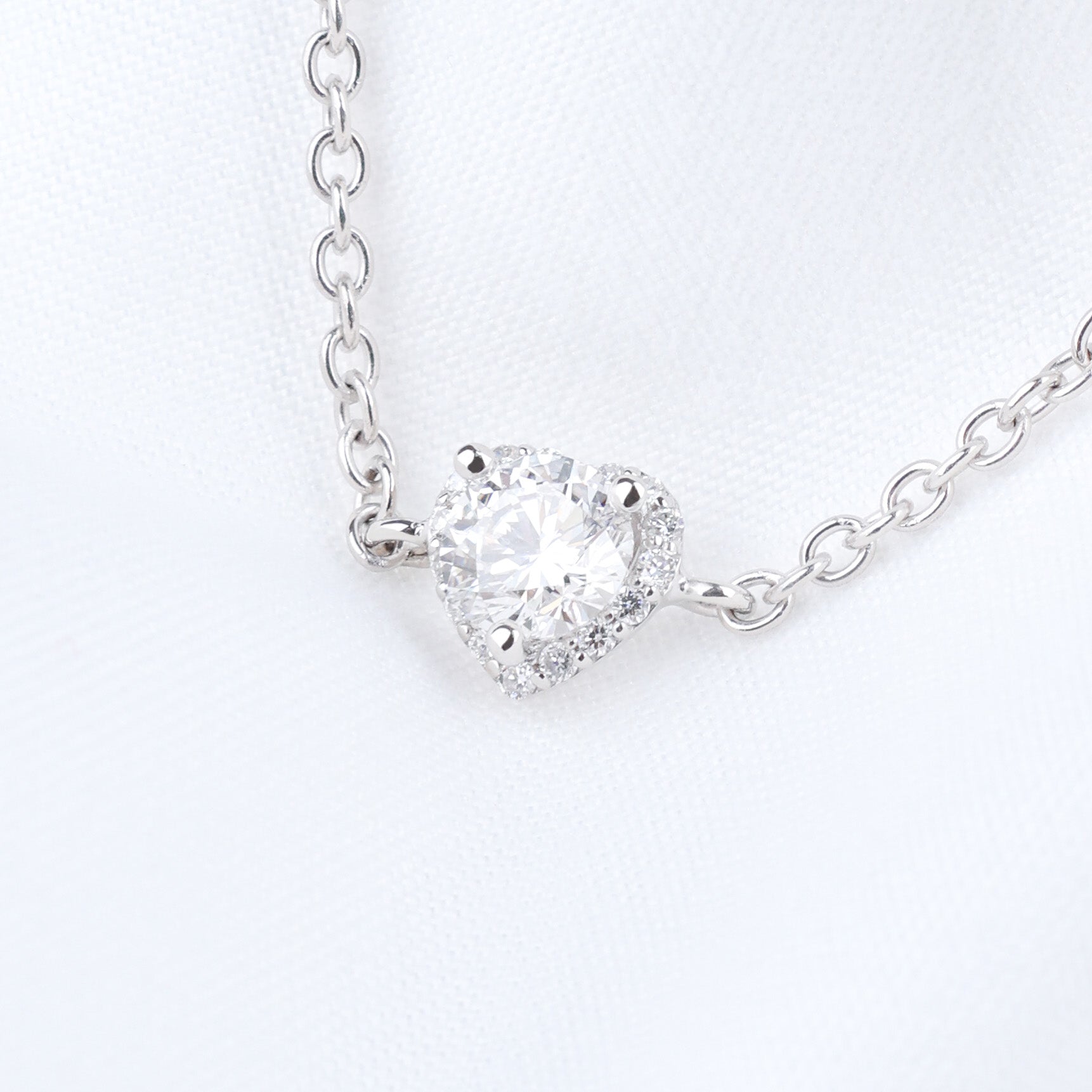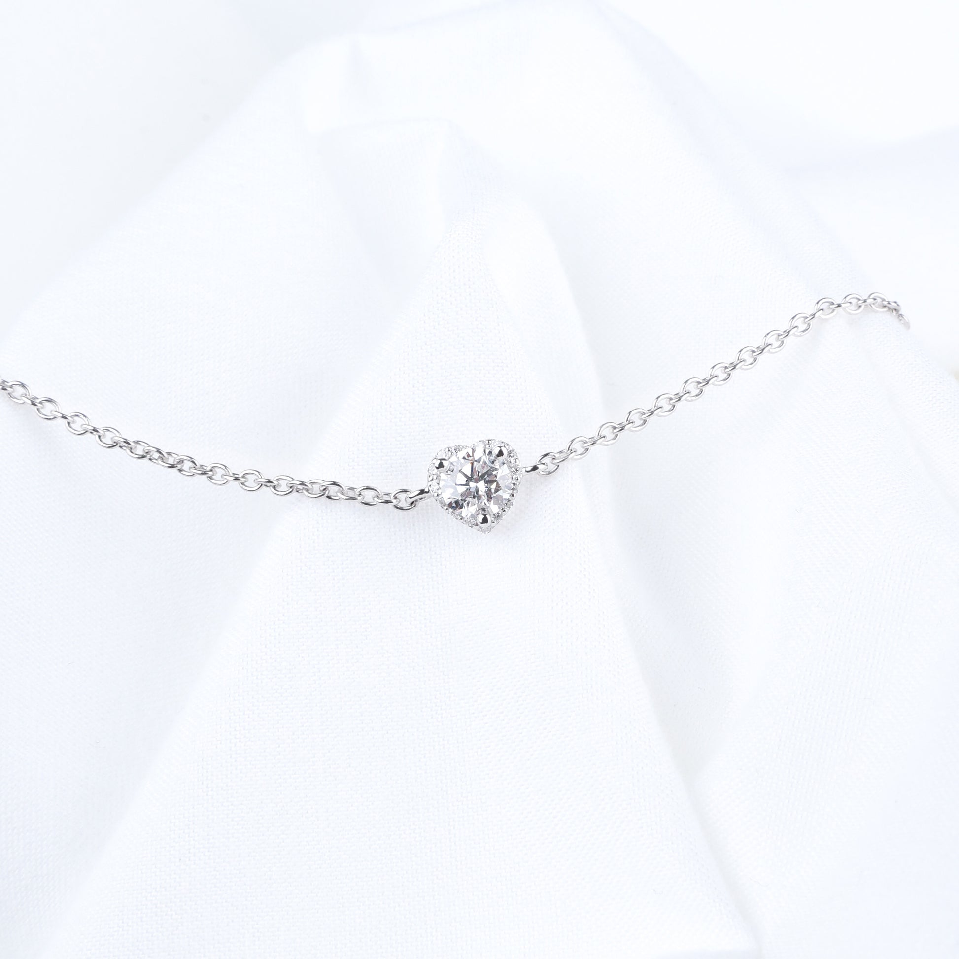 At the center of the pendant rests a 0.5ct round brilliant cut lab-grown diamond that captures an elegantly glowing heart. Surrounding it, 15 melee lab-grown diamonds form a soft halo that completes the heart silhouette. This halo reflects the gentle, luminous light that flows outward from the central stone, enhancing the depth and graceful brilliance of the heart’s radiance.