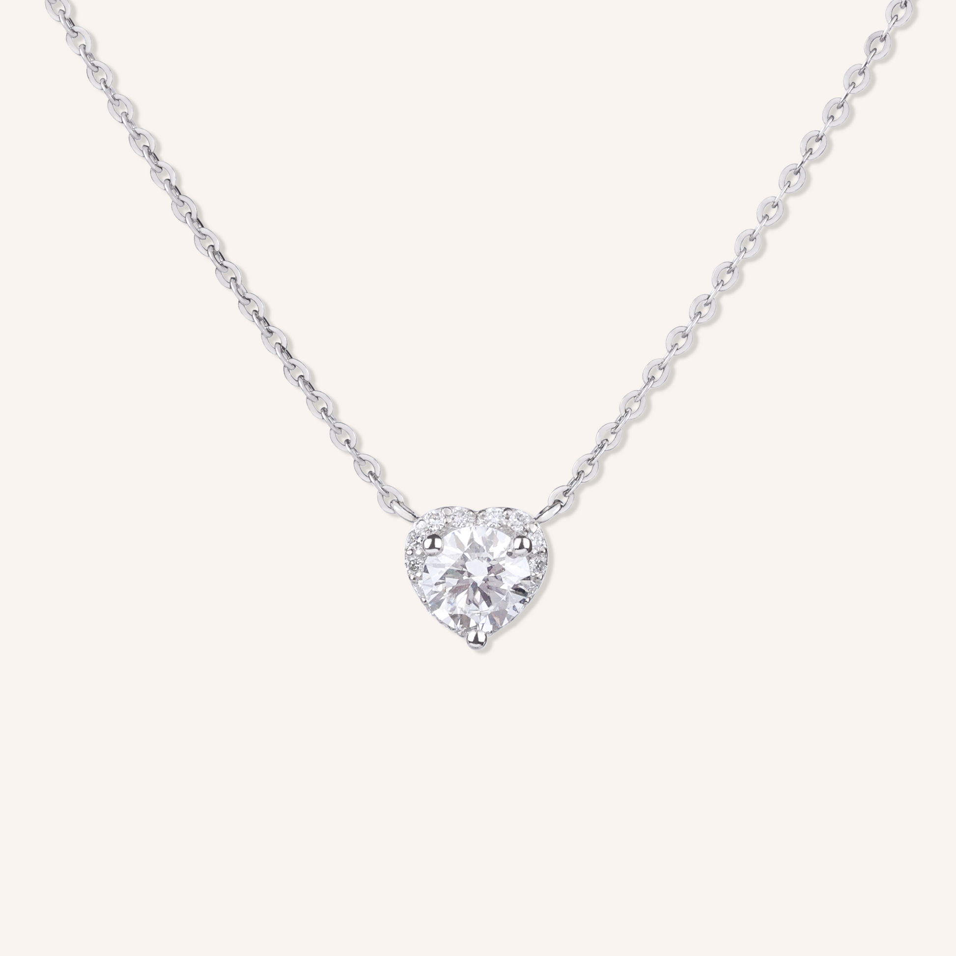 At the center of the pendant rests a 0.5ct round brilliant cut lab-grown diamond that captures an elegantly glowing heart. Surrounding it, 15 melee lab-grown diamonds form a soft halo that completes the heart silhouette. This halo reflects the gentle, luminous light that flows outward from the central stone, enhancing the depth and graceful brilliance of the heart’s radiance.