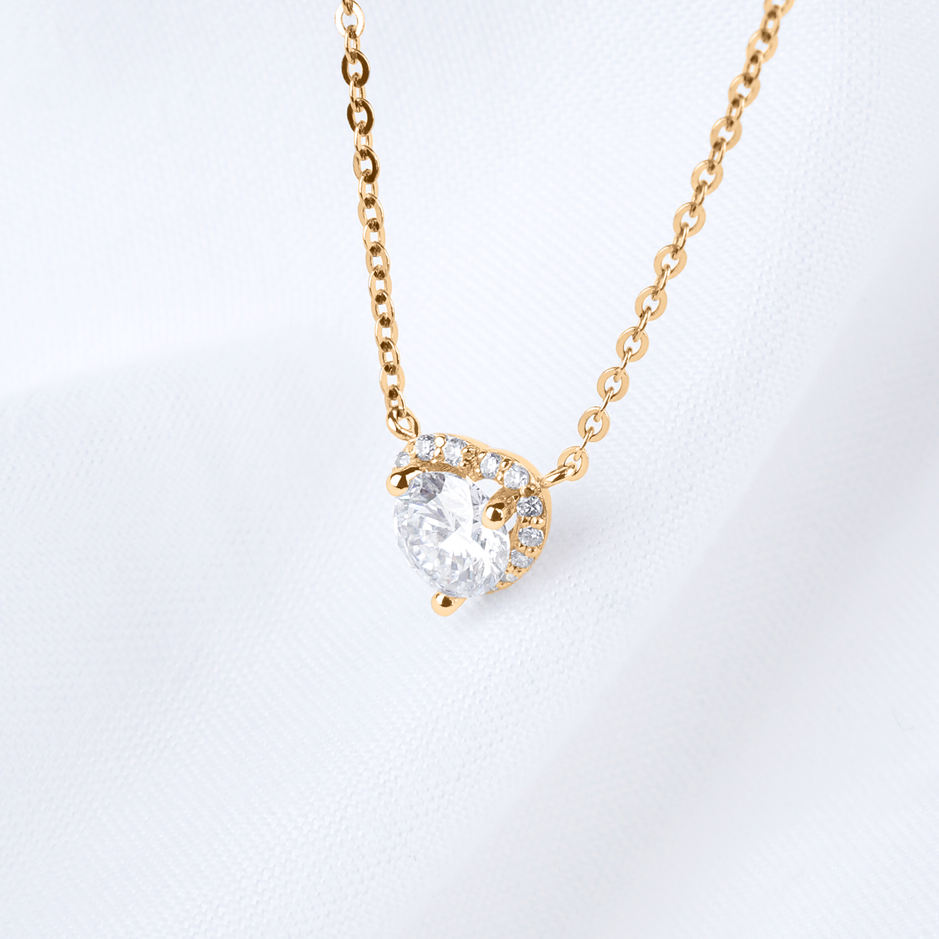 At the center of the pendant rests a 0.5ct round brilliant cut lab-grown diamond that captures an elegantly glowing heart. Surrounding it, 15 melee lab-grown diamonds form a soft halo that completes the heart silhouette. This halo reflects the gentle, luminous light that flows outward from the central stone, enhancing the depth and graceful brilliance of the heart’s radiance.