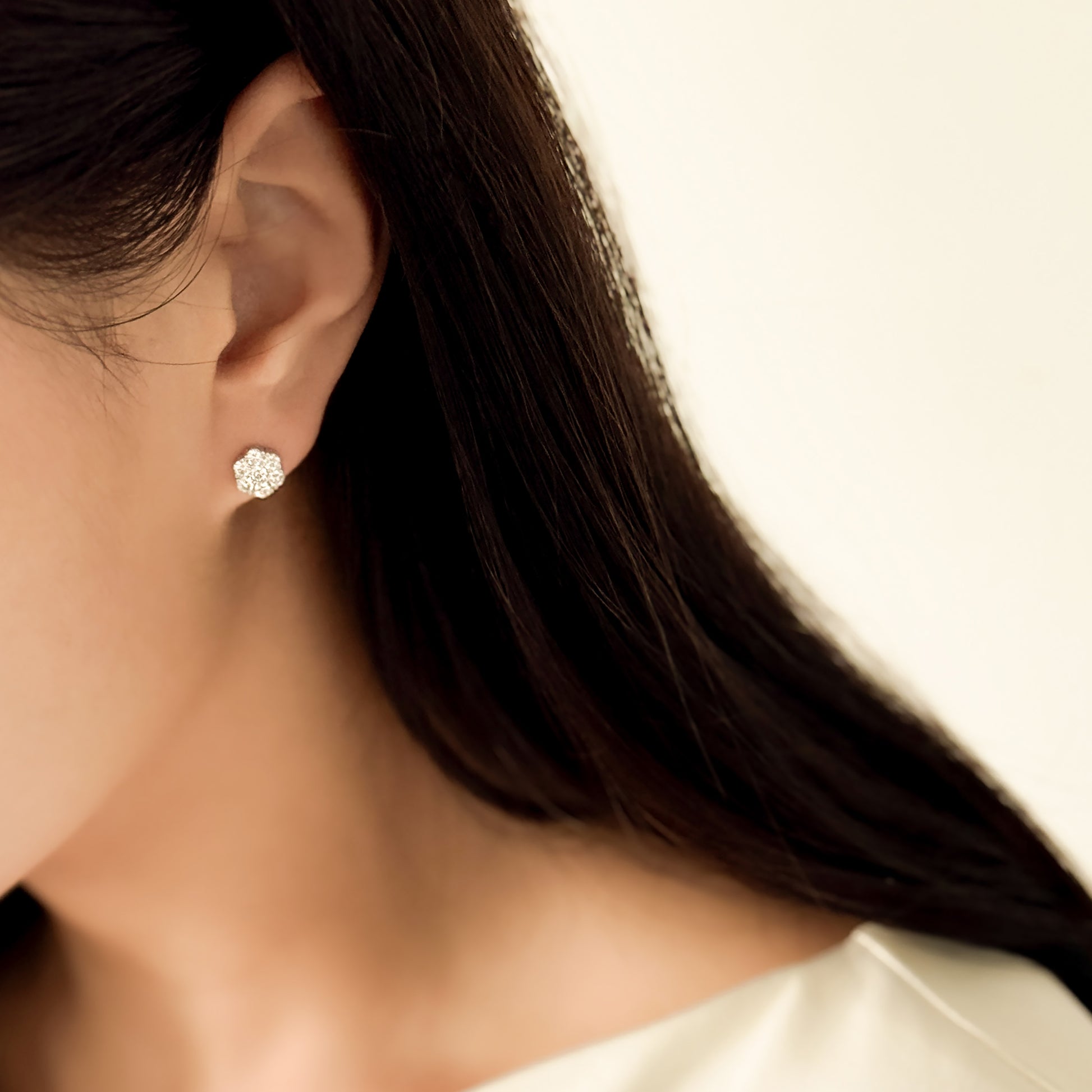 Inspired by the balanced floral geometry found in Korean Dancheong, the Hwaon Stud Earrings embody quiet harmony and refined elegance. Each earring forms a soft, rounded floral silhouette, meticulously set with seven 2.5mm lab-grown diamonds in perfect proportion, illuminating the quiet dignity found in traditional Dancheong motifs. Each curve reflects quiet balance and thoughtful craftsmanship.