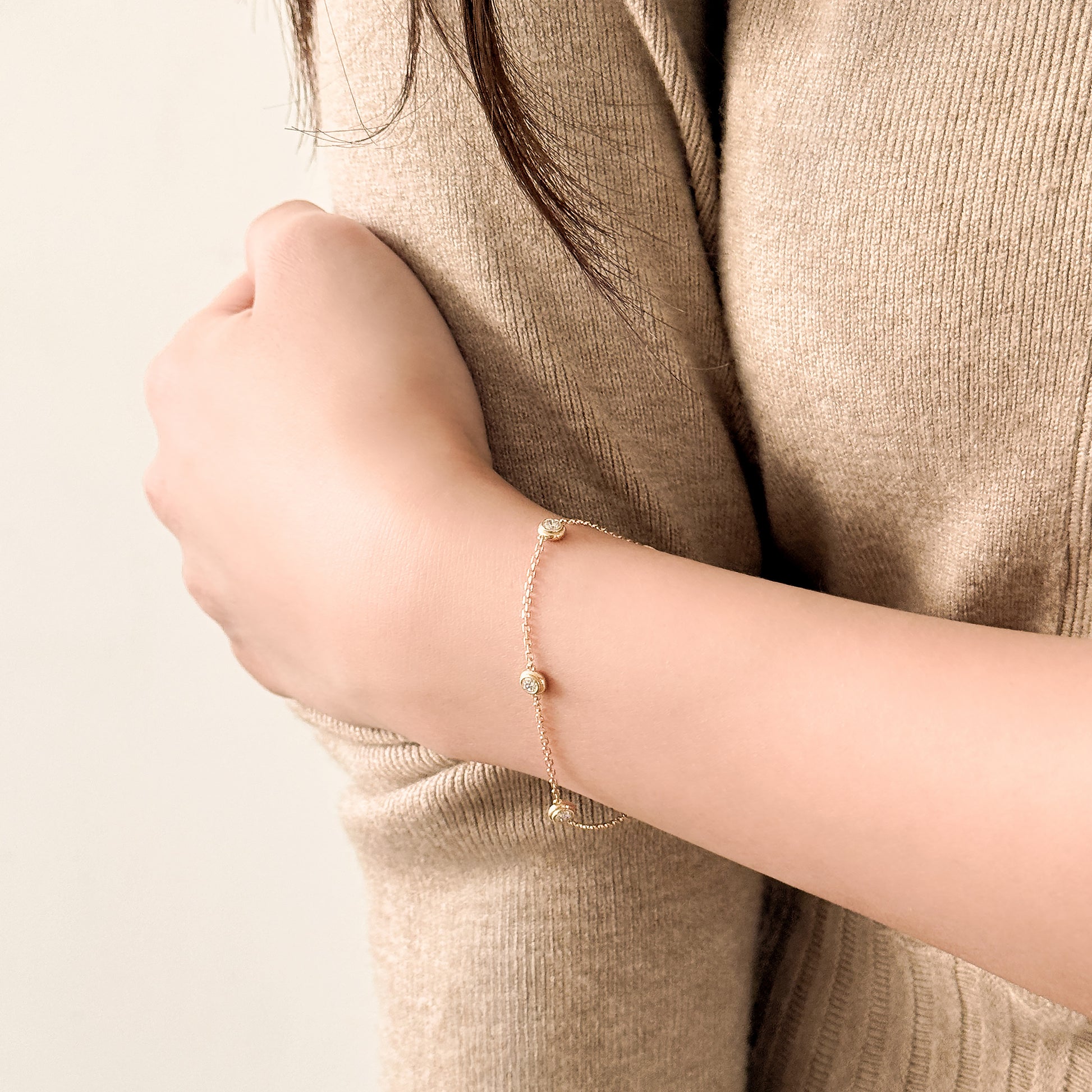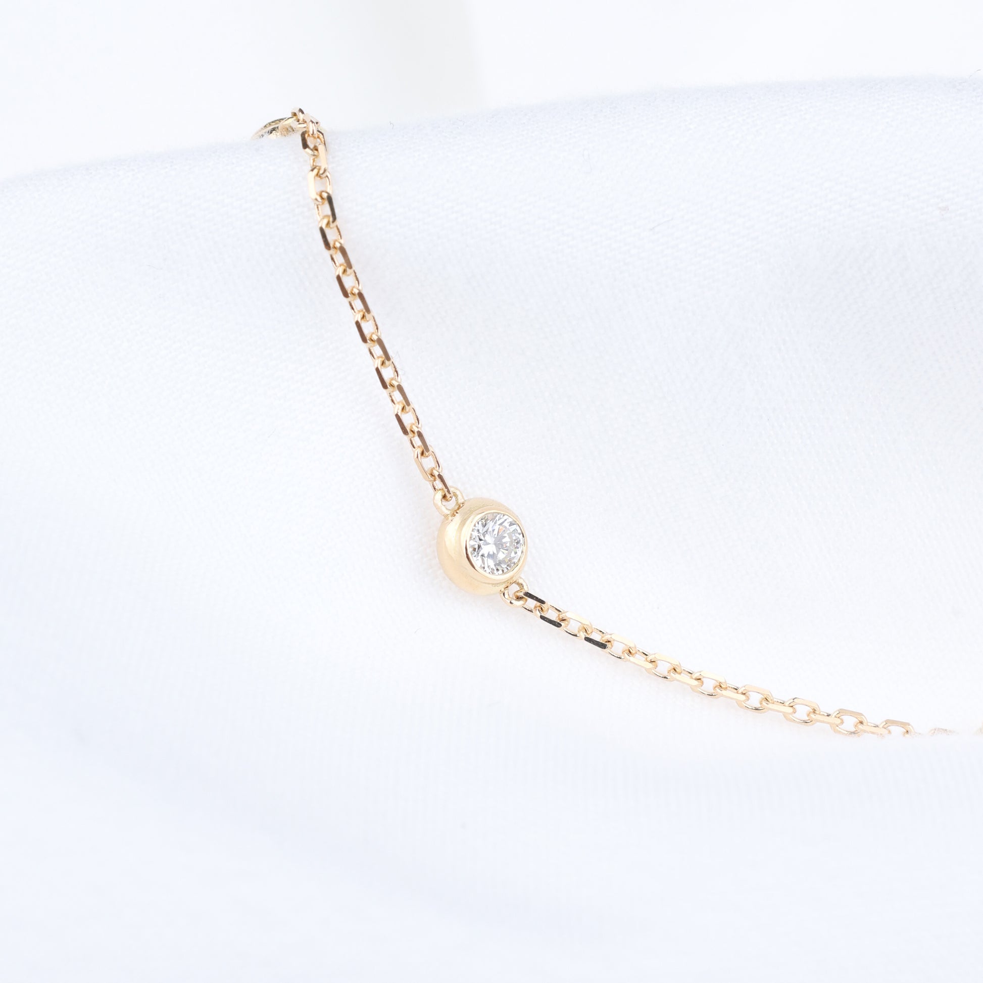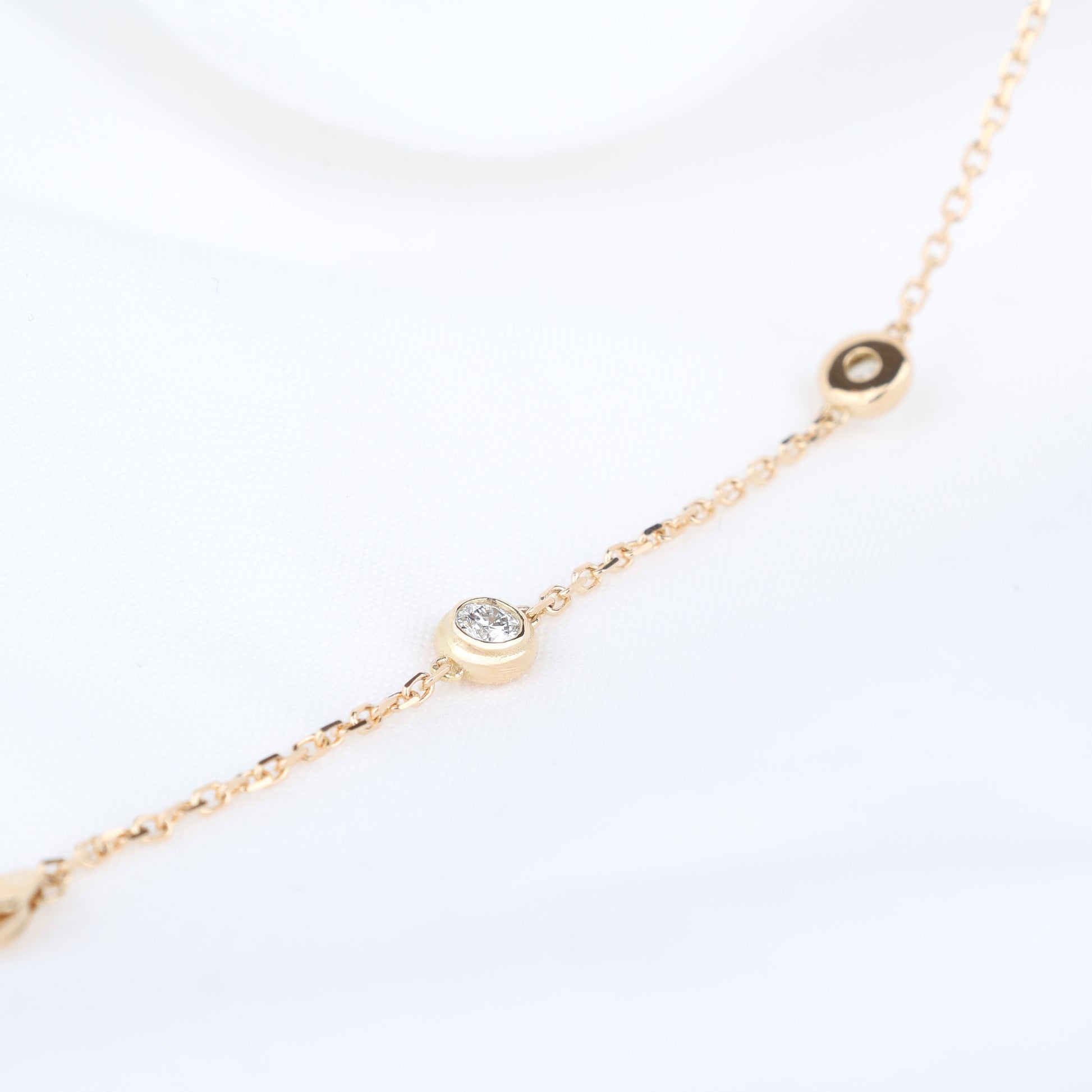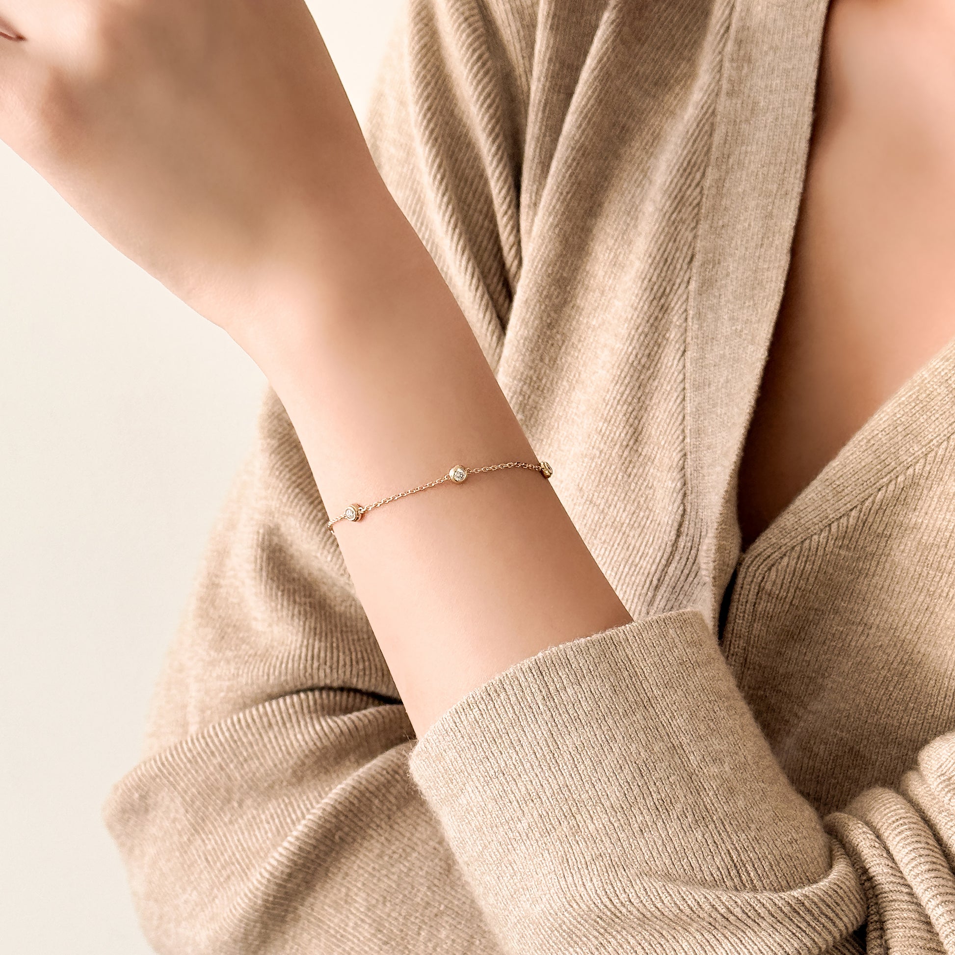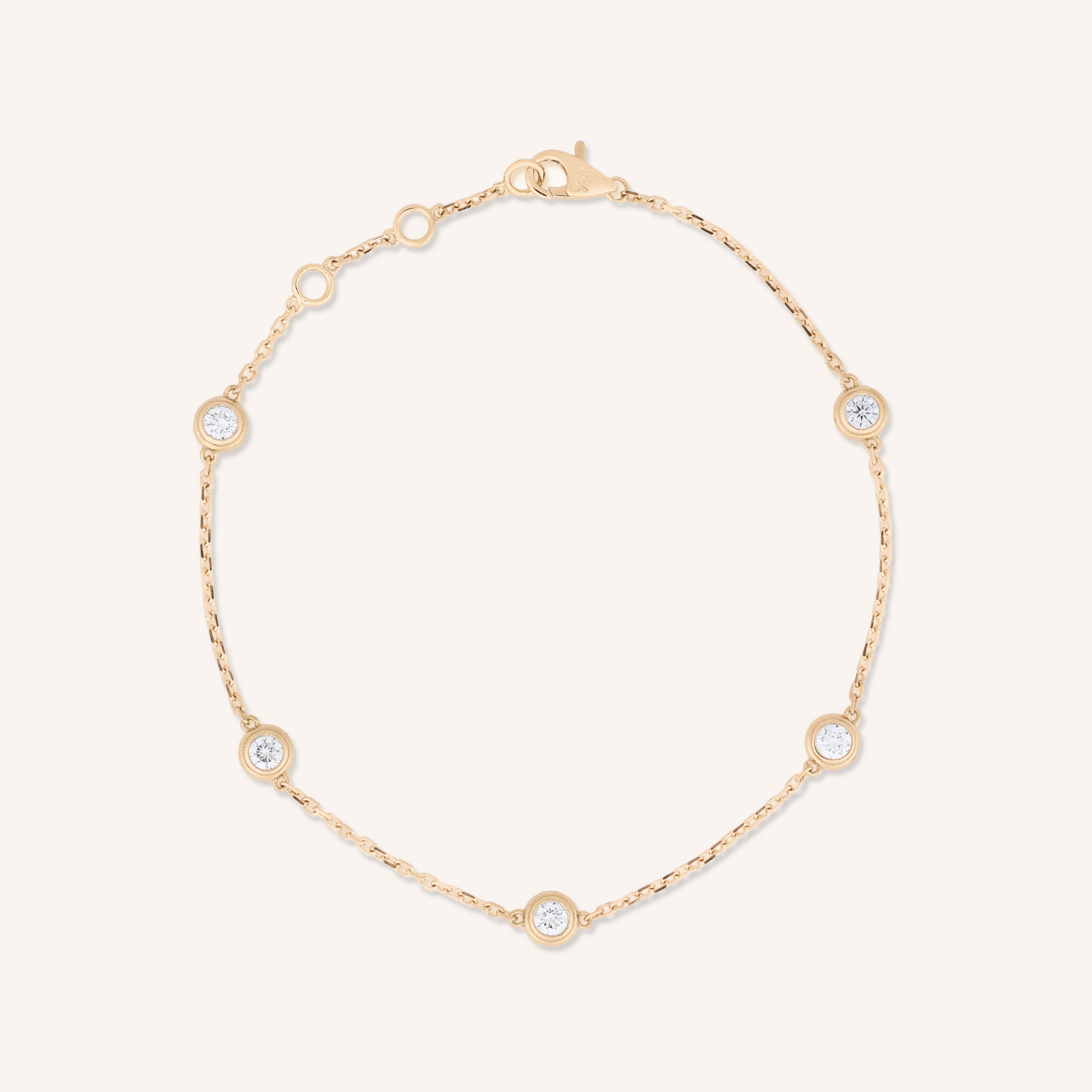 A bezel-set bracelet featuring five 2.8mm round lab-grown diamonds, each framed in smooth solid gold for a clean and timeless look. The evenly spaced bezels create a refined rhythm along the chain, adding subtle brilliance that catches the light with every movement.
