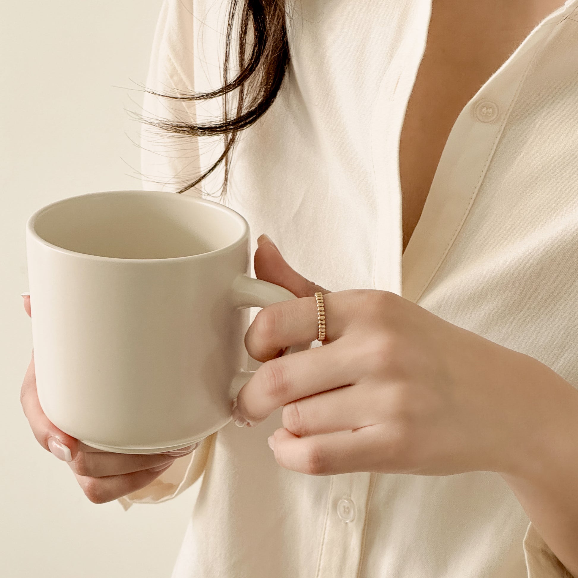 The ring features a softly inflated ribbed silhouette, creating a gentle rhythm of rounded ridges that catch the light with every movement. Its refined volume gives a modern yet timeless presence, balancing bold texture with understated elegance.